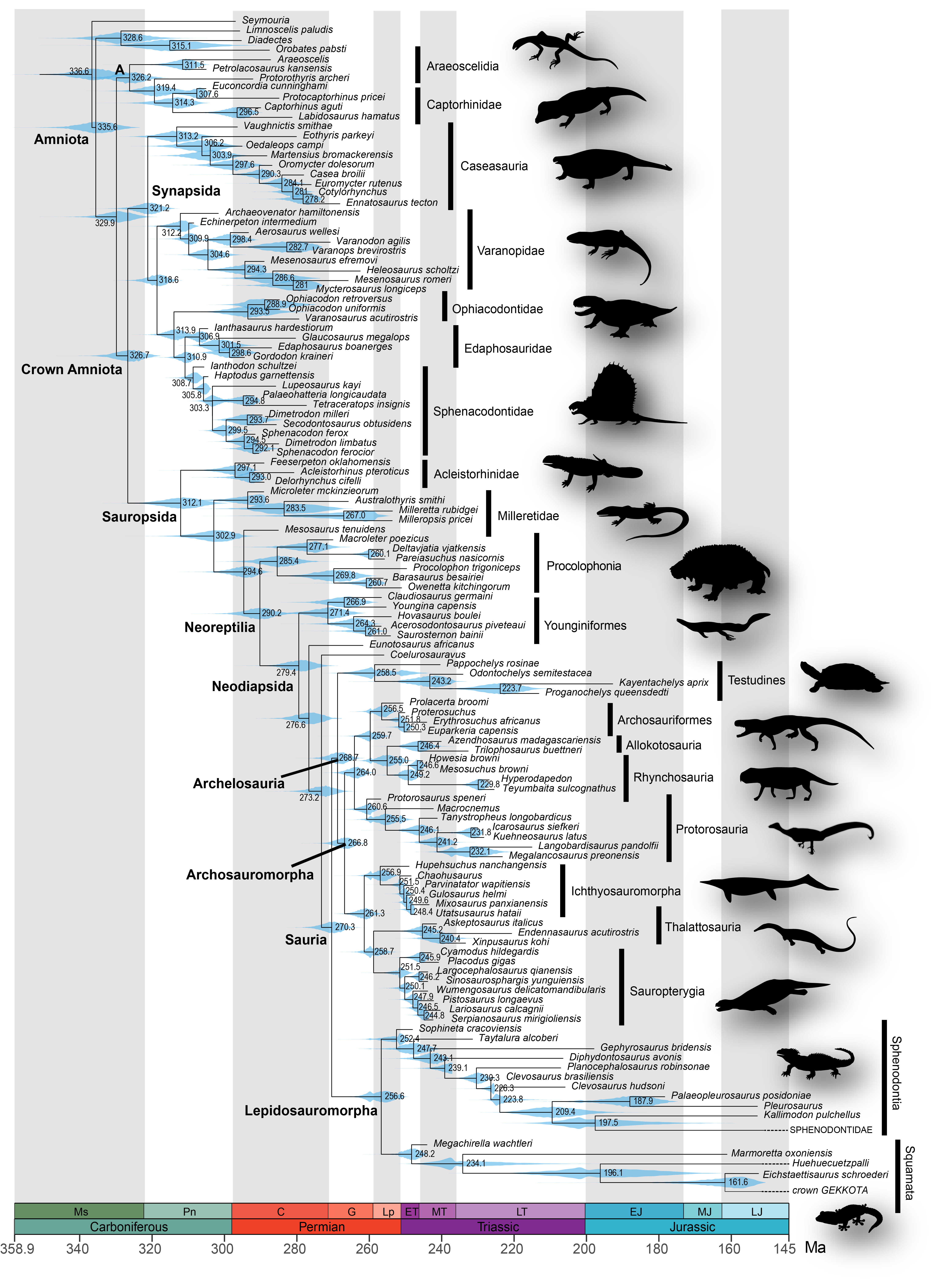Simões, T. R., Kammerer, C., Caldwell, M.W., and Pierce, S.E. 2022. Successive climate crises in the deep past drove the early evolution and radiation of reptiles. Science Advances, 8(33), eabq1898.DOI: 10.1126/sciadv.abq1898.